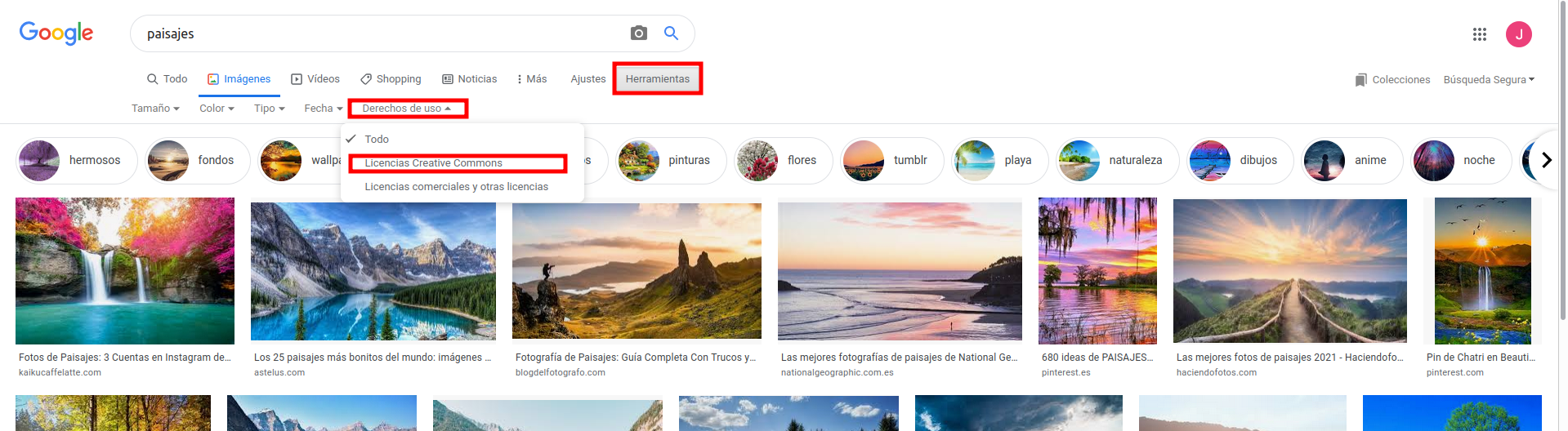- Accede a Google Imágenes y escribe el nombre de lo que quiere buscar: Ejemplo: paisajes.